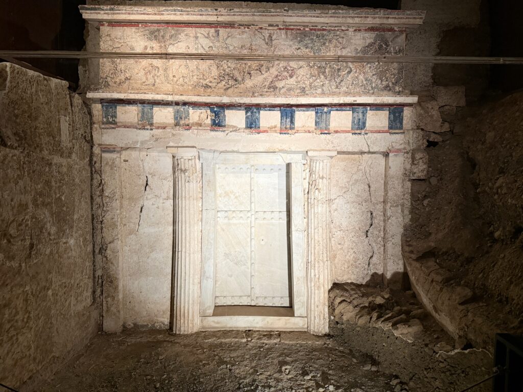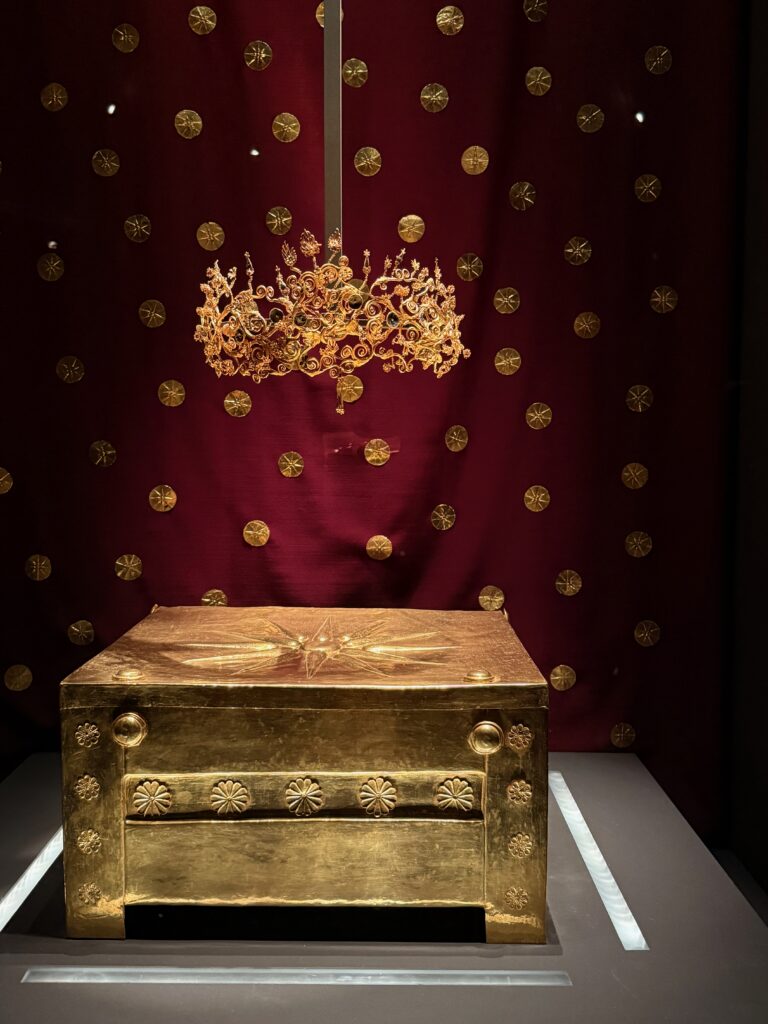 We then continued to the tomb of Philip II. King of Macedon, father of Alexander the Great. What??! The large mound buried the tomb that Alex made for his father who was murdered at 46. Phillip united the Greek city states into one and drilled and disciplined the army creating the phalanx tactic that would pave the way for Alexander to become The Great and lead Greece to conquer Persia. Phillip found and mined SO much gold. The opulence was excessive evidenced by the gold and elaborate crowns found in the tombs. Philip had Aristotle tutor Alexander. These are the players God used to defeat Persia and pave the way for Greek culture to spread. Greek ideas, language, government, theater, and the Greek language which becomes the trade language. This happens 300 years before Christ.